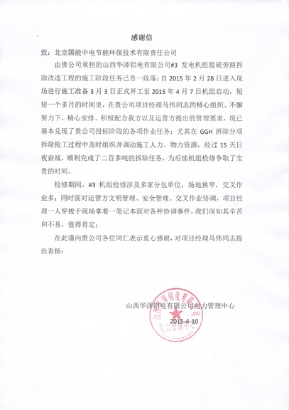 山西華澤鋁電旁路改造EPC項(xiàng)目受業(yè)主表?yè)P(yáng)